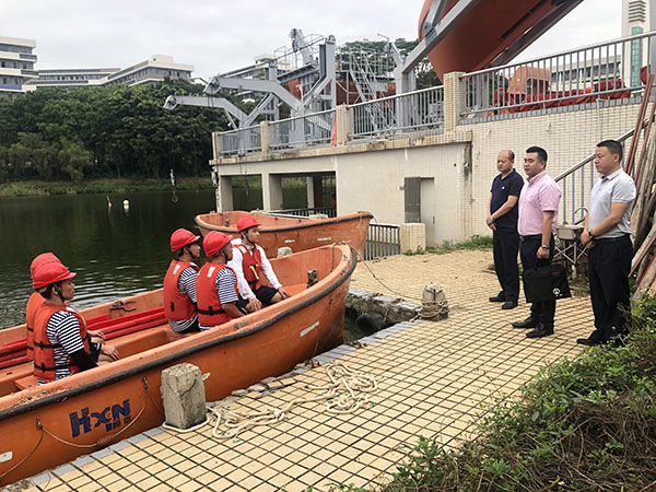 4月26日上午,广东海事局船员处郑永炳副处长、湛江海事局船员处处长邓平贵等一行到湖光校区现场调研公司参加中国船员技能大比武备赛情况。beat365经理贾宝柱、实验训练中心负责人及指导老师陪同参加调研工作。