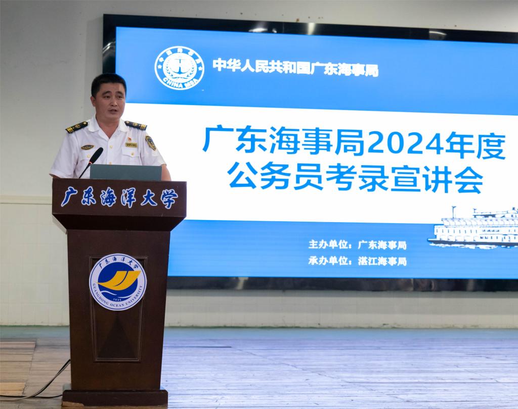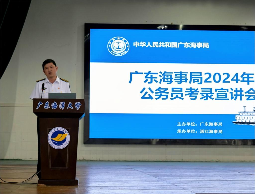 为帮助广大同学全面了解公务员考试,引导和帮助员工积极备考,促进毕业生高质量就业,10月13日下午,由广东海事局主办,湛江海事局承办的2024年度公务员考录宣讲会在公司beat365举行。湛江海事局人事教育处处长刘会清、船员管理处处长邓平贵,惠州海事局大亚湾海事处处长蔡俊杨,船舶与海运公司党委副书记齐昊以及公司300余名师生参加了宣讲会,宣讲会由广东海事局人事教育处陈亚良主持。