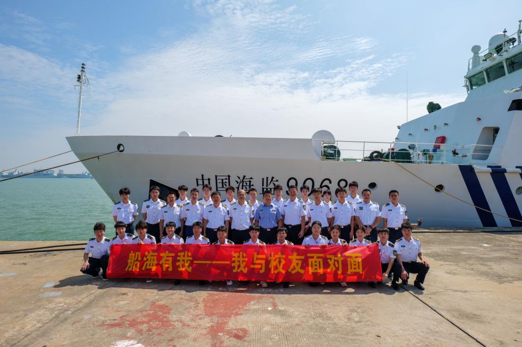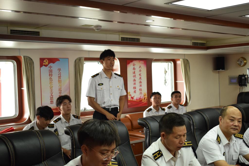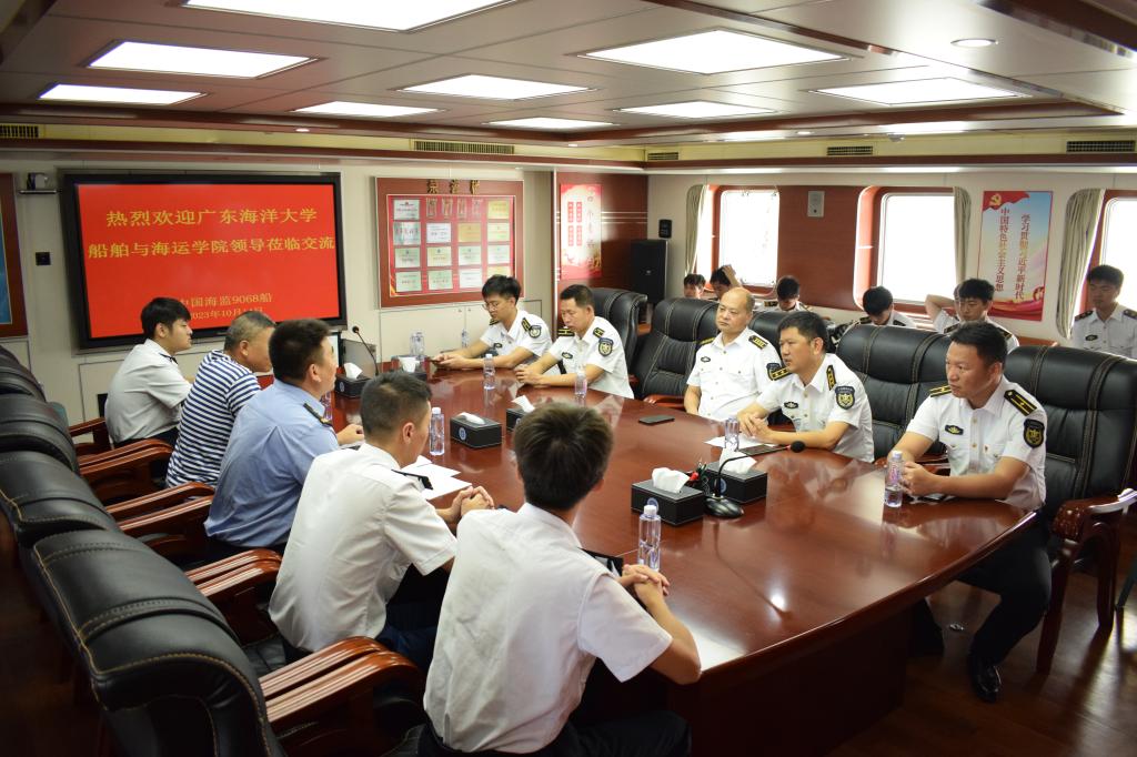 首先,王磊带领同学们参观了中国海监9068执法船,详细介绍了舰船光电跟踪取证系统、航行警告接收机等设备,为同学们上了一节生动的专业课,并前往执法船会议室开展座谈交流。