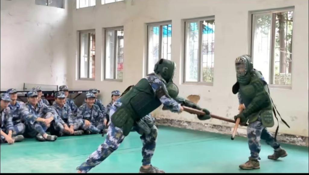 刘抒睿向同学们讲解了“刺杀操”不仅是一项近战歼敌的战斗技能,更是培育战士的血性胆气,锻炼“逢敌亮剑,有我无敌”的勇士精神。随后现场指导同学们进行了“拼刺”实战,让同学们亲身体验“敢于刺刀见红,狭路相逢勇者胜”的战斗。