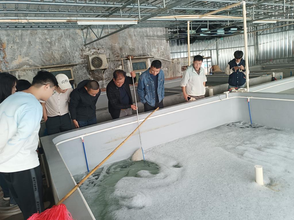 首先,李武介绍了乐民镇水产养殖产业情况及面临的技术难题。随后,特派员团队深入海山村港乐养殖场参观调研,了解了池塘智能清污机器人的使用场景与行业困境,并与养殖户就机器人的升级改造、应用示范点的建设进行了充分讨论。最后,同行专家对养殖户进行了针对性的技术指导与培训。