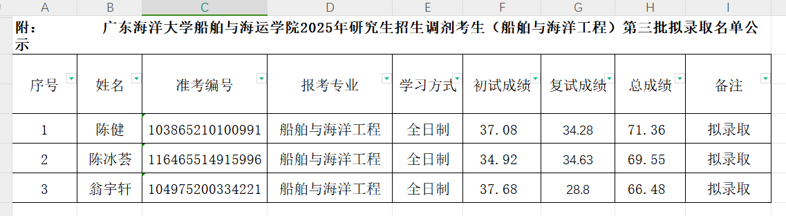 根据公司及公司研究生招生工作的相关文件精神和要求,经公司研究生招生录取工作领导小组审定,将公司2025年硕士研究生招生调剂(船舶与海洋工程)第三批考生复试成绩及拟录取名单公示。如有拟录取考生自动放弃,按总成绩排名依次递进。