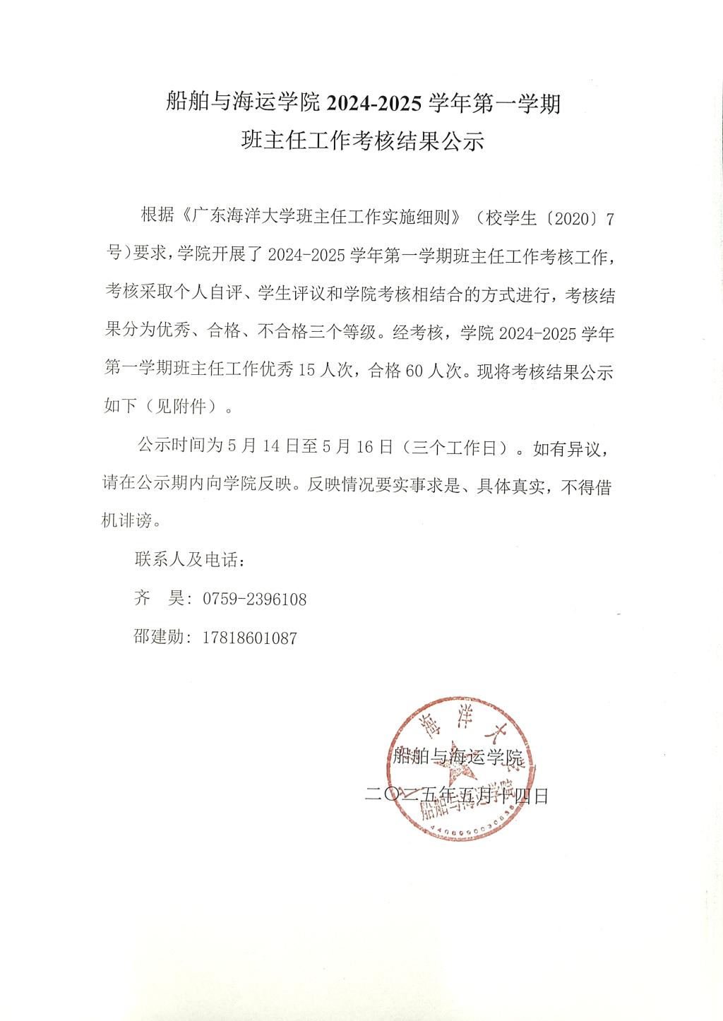 根据《beat365官方网站班主任工作实施细则》(校员工〔2020〕7号)要求,公司开展了2024-2025学年第一学期班主任工作考核工作,考核采取个人自评、员工评议和公司考核相结合的方式进行,考核结果分为优秀、合格、不合格三个等级。经考核,公司2024-2025学年第一学期班主任工作优秀15人次,合格60人次。现将考核结果公示如下(见附件)。