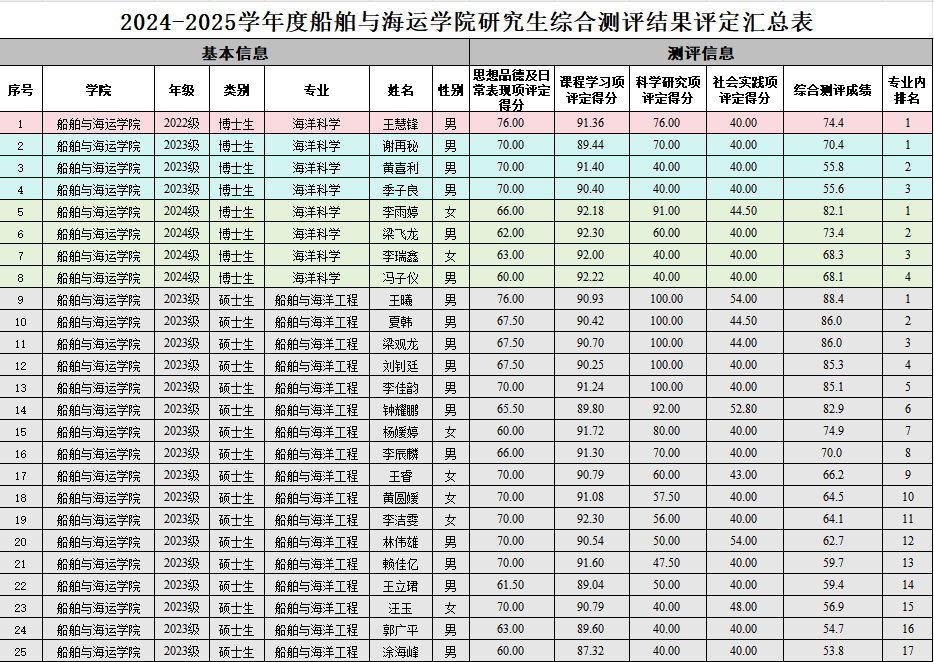 根据《关于做好2025学年全日制研究生素质综合测评及奖助学金评审工作的通知》(校员工〔2025〕37号)要求,按照《beat365官方网站研究生综合测评办法》(校研究生〔2020〕7号)执行,经个人自评、班级测评及公示、公司审核,现将beat3652024-2025学年度研究生综合测评结果公示如下: