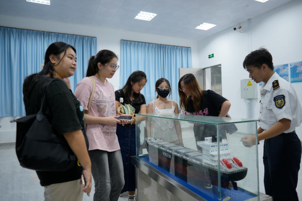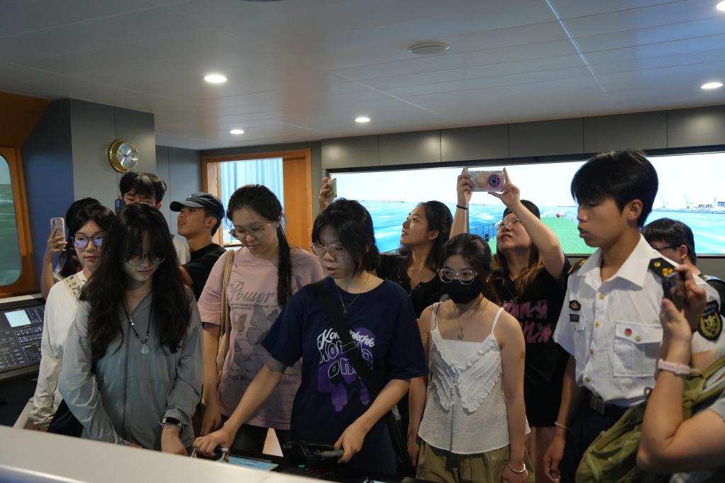 探访的高潮出现在航海科技与文化科普教育基地的航海模拟器前。同学们轮流进入模拟驾驶舱,仿佛化身为真正的船长,面对着逼真的海洋环境和航线图,体验了一把在浩瀚大海上驾驶船舶的紧张与刺激。